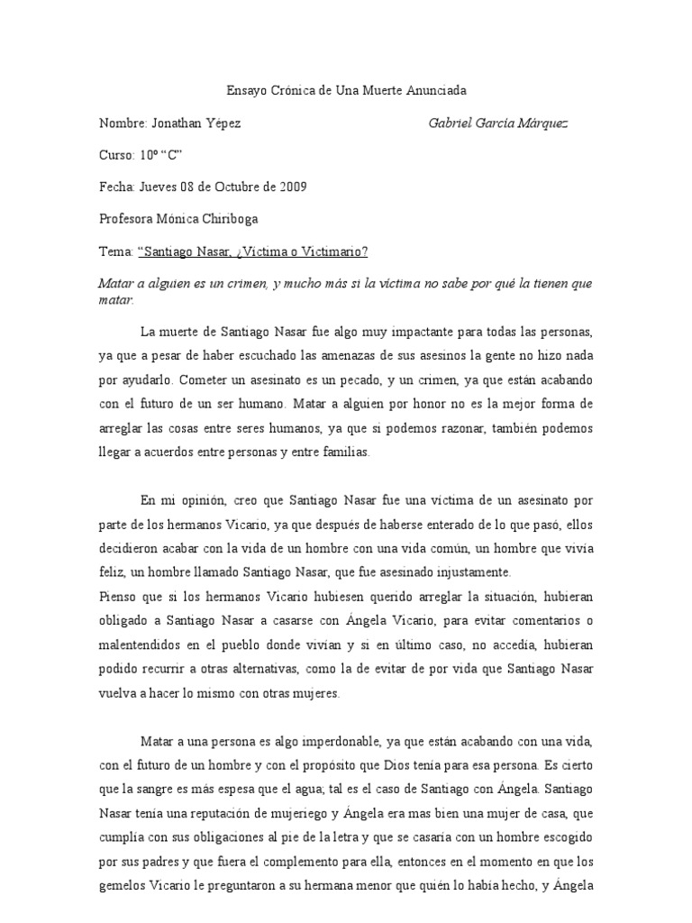 Ensayo Cronica De Una Muerte Anunciada Asesinato Homicidio