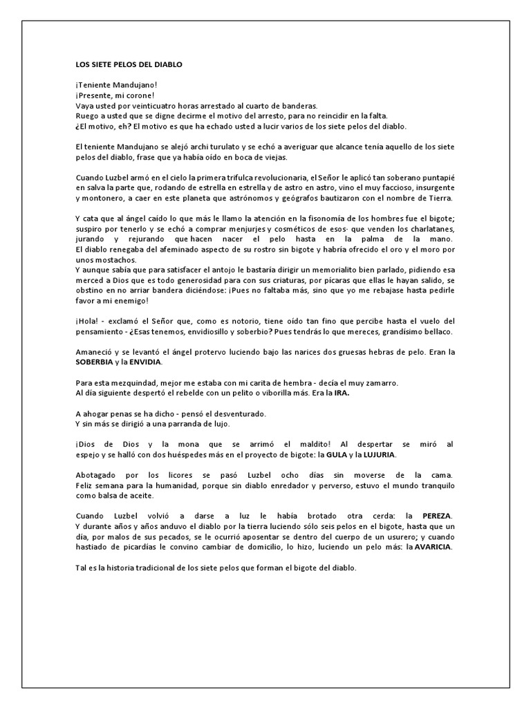 Los Tres Pelos del Diablo. Por los mismos das pas el rey por aquella aldea sin que nadie le conociese y preguntando lo que haba de nuevo le respondieron que. EL Chifln del Diablo 8.