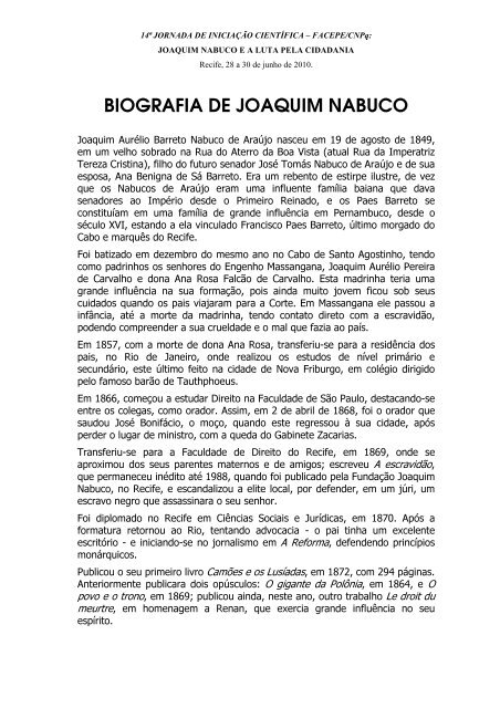 Nascido em Recife foi Historiador Jurista Jornalista Escritor Politico e um dos fundador da Academia Brasileira de Letras. O jornalista e ativista poltico Jos do Patrocnio 1853-1905 colaborou com a campanha pela abolio da escravatura no Brasil e ao lado de Nabuco fundou a Sociedade. Roponho-me ocupar-me de duas obras fundamentais de Joaquim Nabuco O abolicionismo e Um estadista do Imprio sugerindo as conexes entre ambas a despeito de que redigidas em perodos diversos da sua exis - tncia elas podem parecer primeira vista serem mutuamente estranhas ou at opostas.