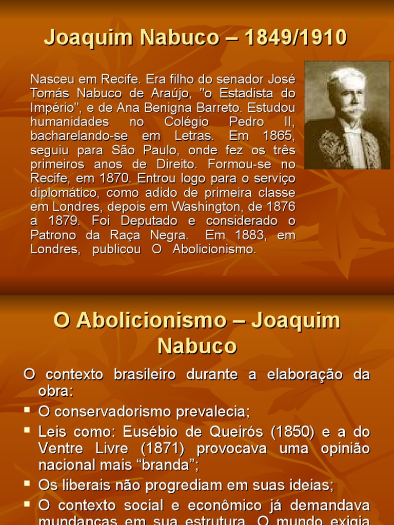O abolicionismo joaquim nabuco resumo. O abolicionismo foi visto por Nabuco de forma a transcender o aspecto humanitrio da explorao da raa negra mas tambm como uma necessidade de desenvolvimento moral e econmico para o pas. Joaquim Nabuco foi um dos grandes expoentes do abolicionismo no Brasil. Desde a colnia o regime escravo consistia na utilizao de.