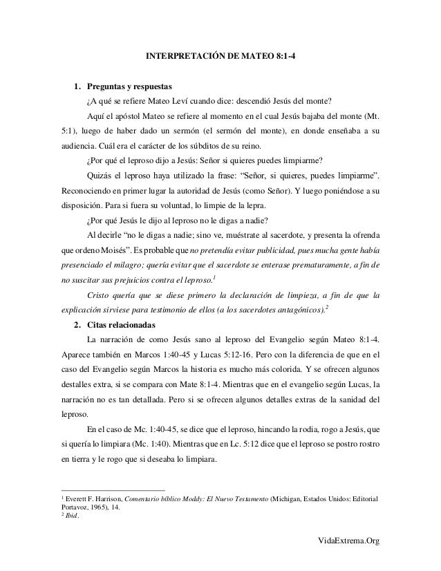 Parece que de ambos uno era ms prominente y a l se refieren en detalle Marcos y Lucas. 1 Cuando Jess baj de la montaa lo sigui una gran multitud. 2 Y he aqu que un leproso se aproxim se prostern delante de l y le dijo.