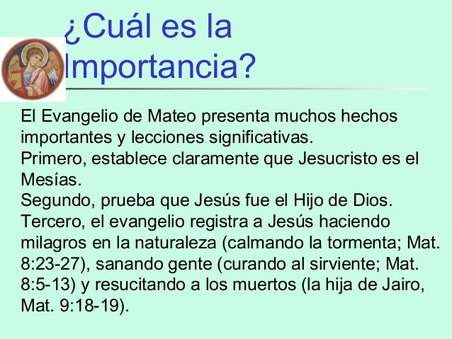 En los captulos 8 y 9 de este Evangelio el autor nos relat 12 milagros. Roma era repblica del 509 hasta 27 aC. El libro en s mismo es annimo pero la primera tradicin confiable lo liga a Mateo el recolector de impuestos quien fue uno de los doce apstoles que Jess nombr y de hecho l aparece en el libro mismo.