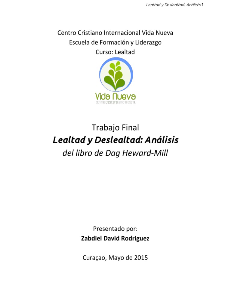 La primera como una lectura informativa sobre una problemtica latente en las iglesias cristianas con ejemplos vvidos y consejos que nacen del aprendizaje que otorga los aos. Lo mejor es que es totalmente gratuito y que lo puede descargar para cualquiera de sus dispositivos electrnicos. Nos explica porque es importante la lealdad cuando una persona llega a ser desleal y sus distintas etapas nos ensea que dice la Biblia sobre la lealtad nos pone ejemplos de personas que fueron desleales en la Biblia y en la vida del autor nos.